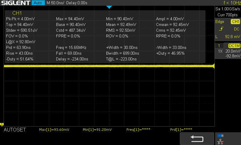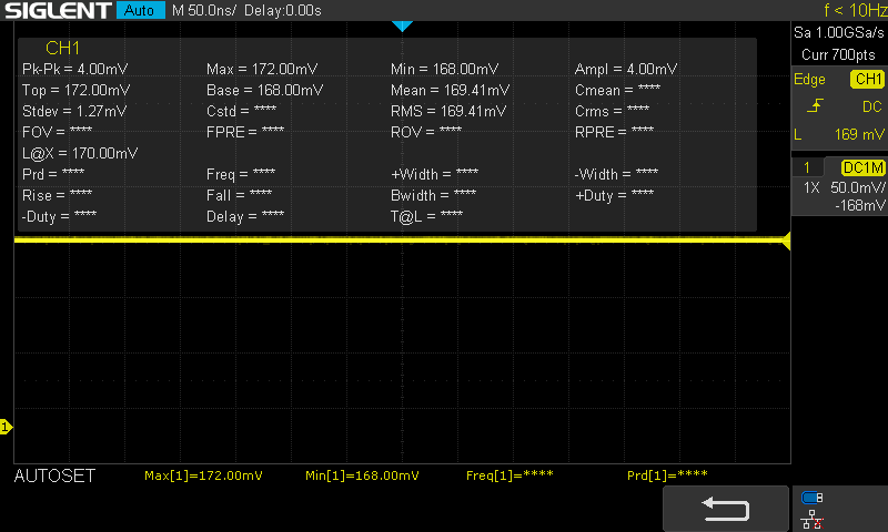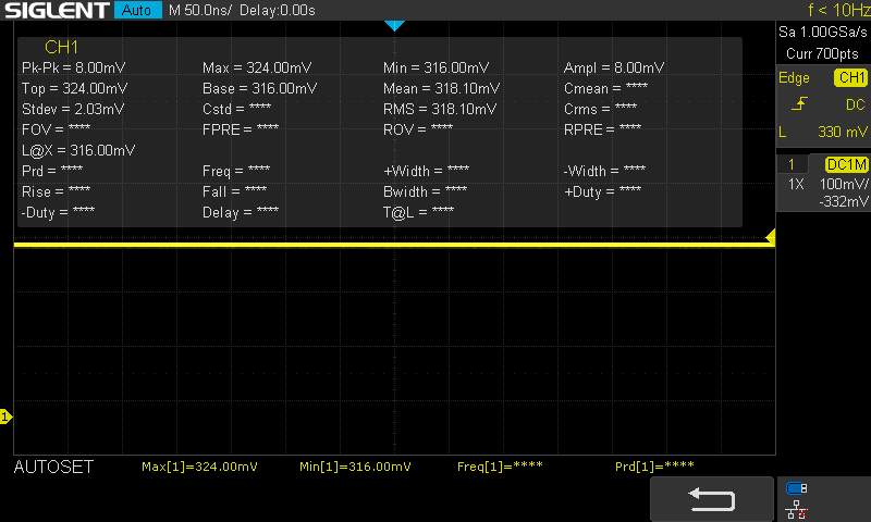 Below are some screenshots from the oscilloscope. The flat graph and max/min values show that there is no flicker. The max/min values would ideally be identical, but since I was hand holding the detector it may fluctuate a little bit as it moves back and forth towards the light source. They are similar enough and far enough above 0 to say with great confidence that there is no flicker.