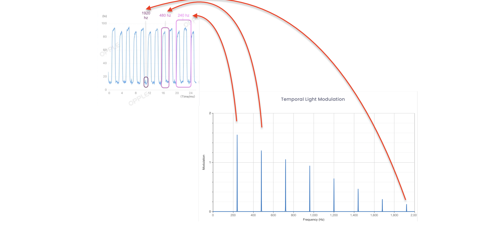 As we can see, the above is like a slope that heads downwards from 240 to 1920 hertz. From here, the pattern suggest it is a 240 hertz quasi-sine wave. (think of it as a fake or a knock-off sine wave). This corresponded to the Opple graph readings we had. (1920 hertz), 480 hertz and 240 hertz respectively.