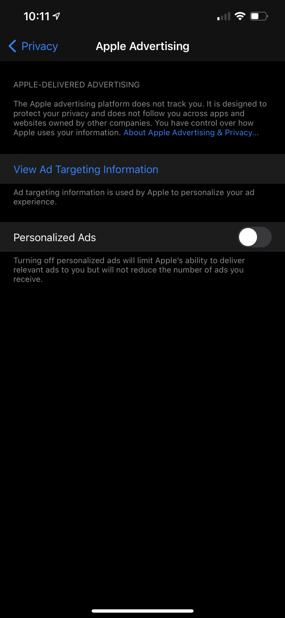 If Personalized Ads is turned on, Apple’s advertising platform may use your information to serve ads that are more relevant to you. Turning off Personalized Ads will prevent Apple from using this information for ad targeting. It may not decrease the number of ads you receive, but the ads may be less relevant to you.