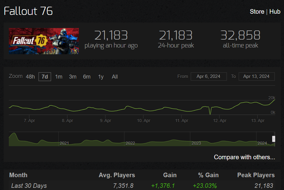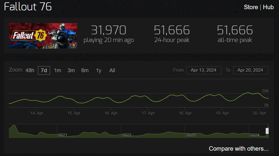 Fallout 76 is getting near its all time player level of 32k, with a 28,000 people in the last 24 hours.