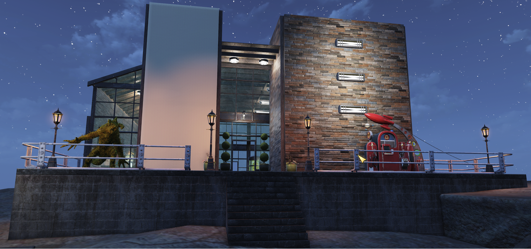 I have to say this is the best camp that I've built so far. I can't say that i'm all that imaginative, but rather I take inspiration from other people's camps. I saw something similar and while this is not a 1 for 1 copy, (there's a lot I did copy) I did take their design queues and using the same design language. Took all day to figure out how to do this, within the confines of my camp space. I'm on the edge a cliff over-looking the Whitespring resort.