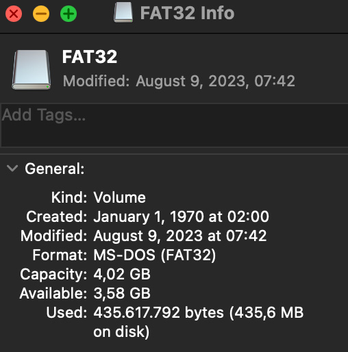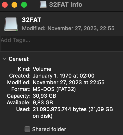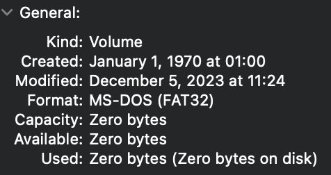 When I connect USB pendrives formatted as FAT32 to my new M3Pro MBP, either through an USB-A/C adapter, ort through a TB4 hub, I can read them without any problem, but I cannot write anything to them, as they show 0 capacity in Finder (see screenshots). I also can delete files, so it's not that they are read-only.
