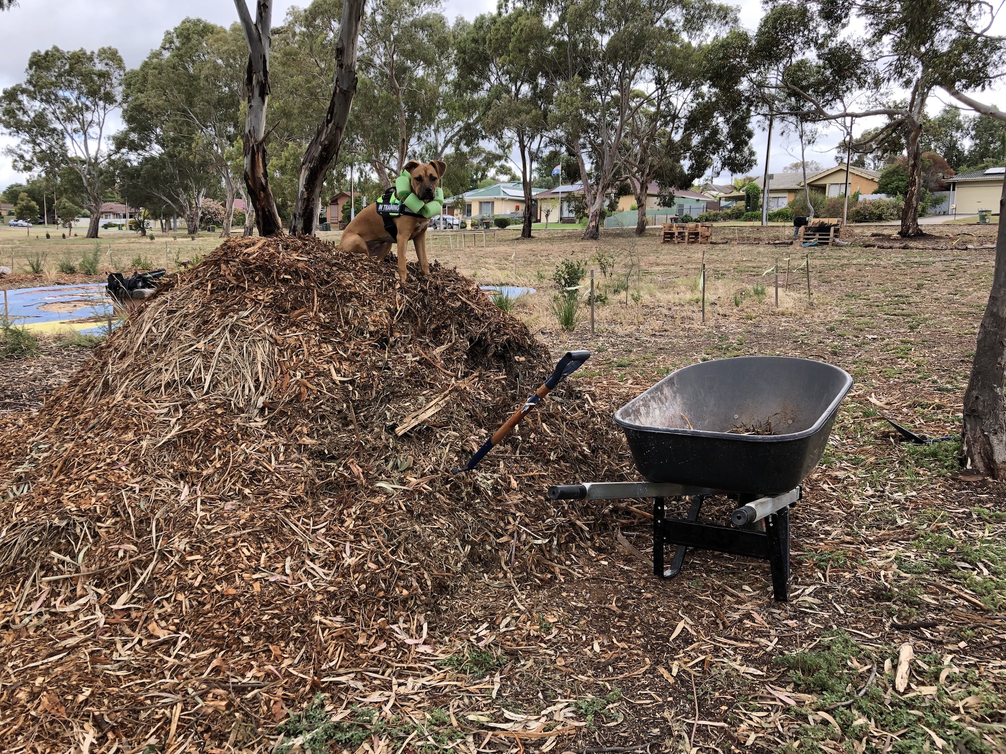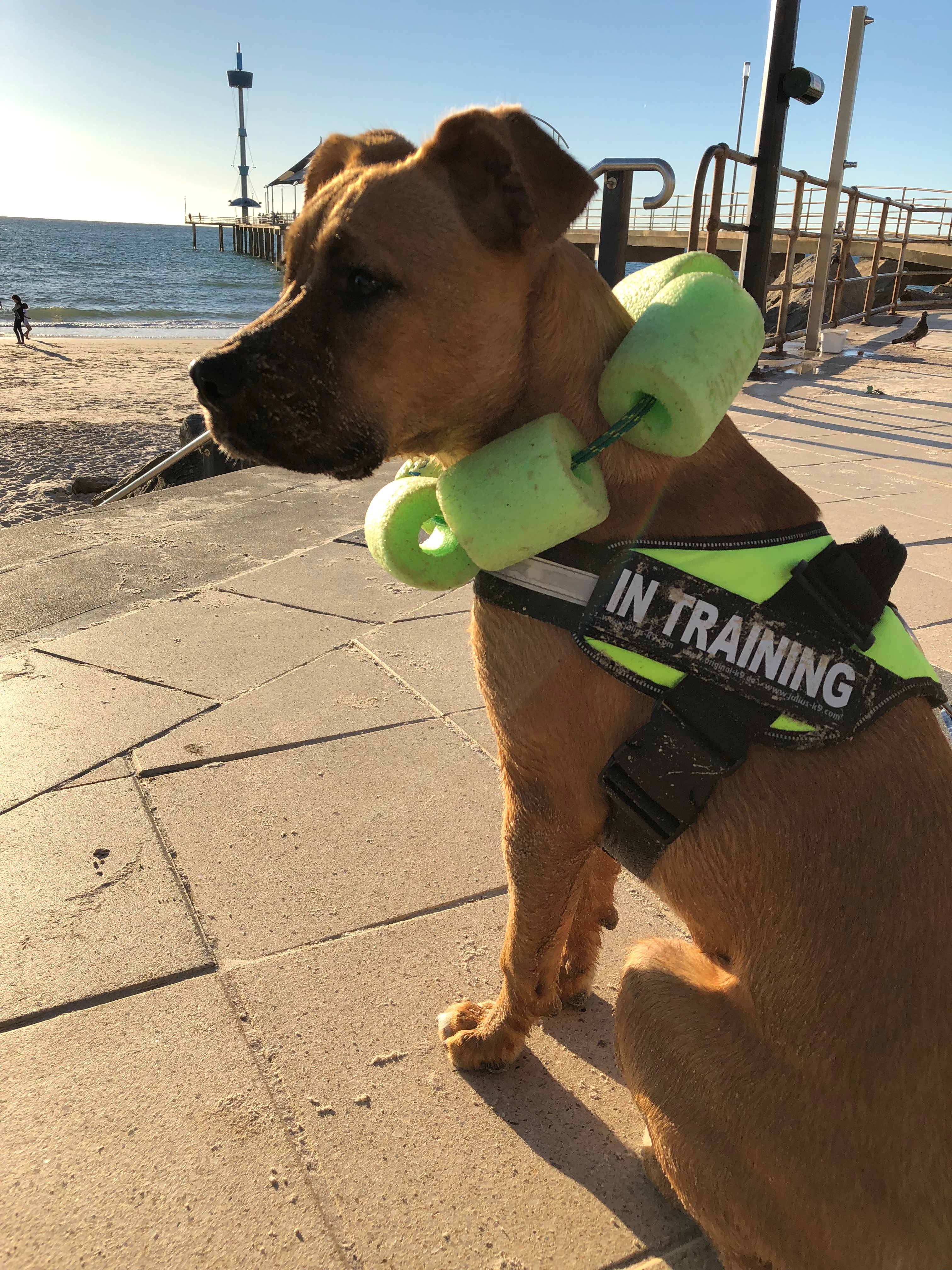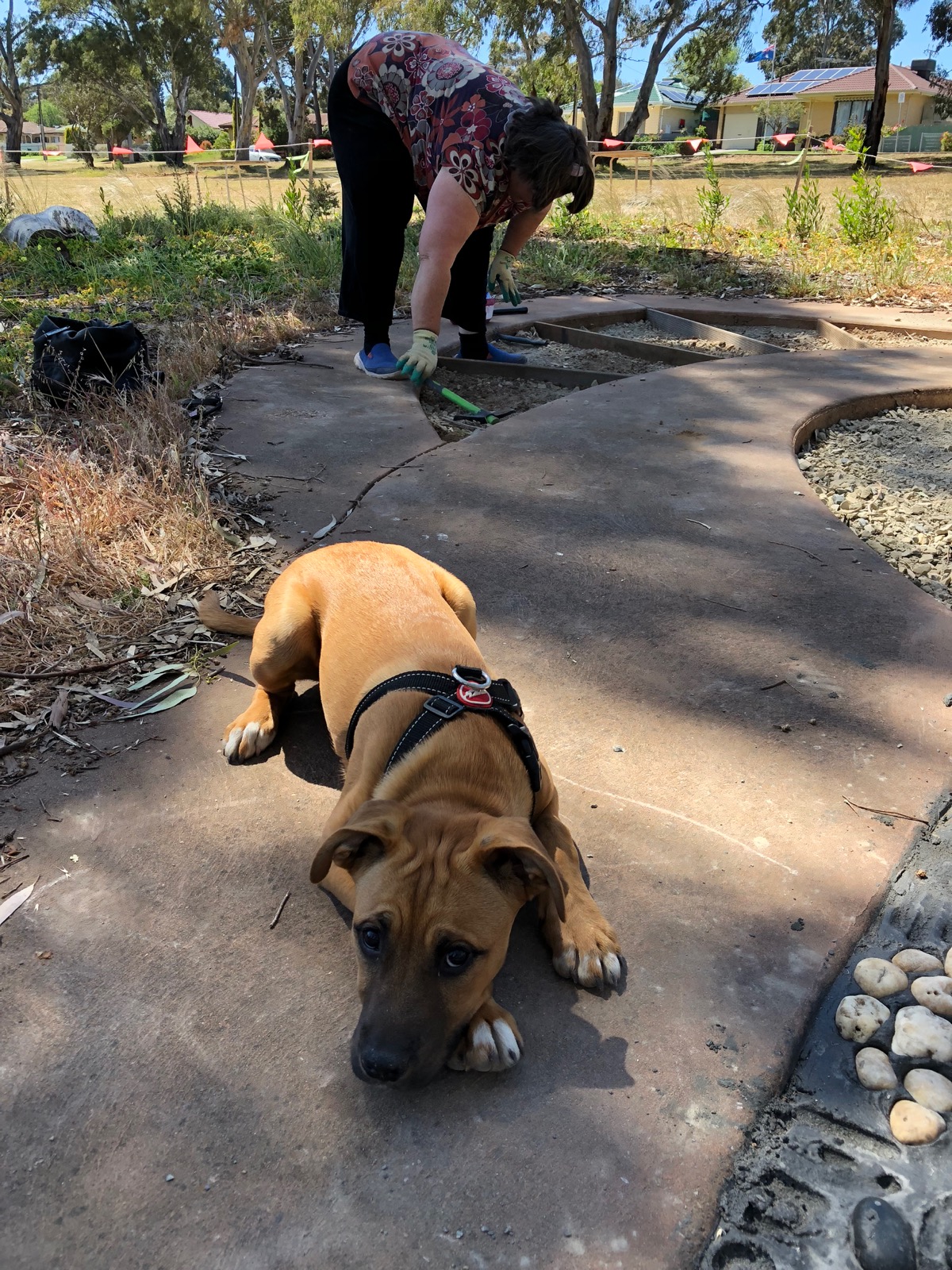After a full day festival for mental health, we went for a stroll through the parks & along the riverway. She loved the waterjets in the background here that you can just make out. She loves streams or jets of water, but I can't let her play like that at home with the hose as it actually causes all manner of obsessive issues, which would then make training a problem later on... But apparently these type of waterjets are okay for her, as it's not operated or held by me!
