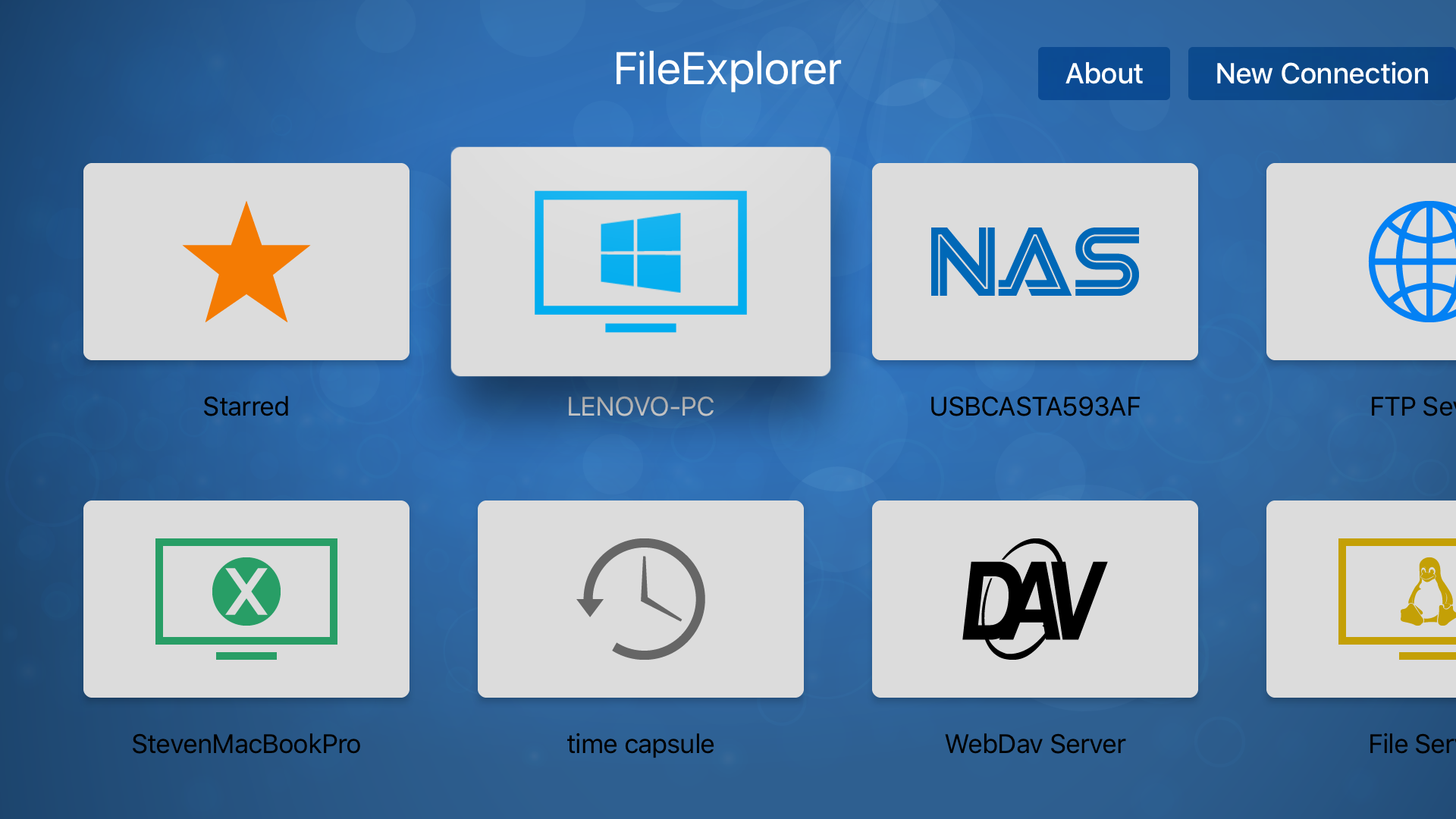 FileExplorer for TV helps you to access files on your computer (Mac OS X, Windows, Linux) and NAS from Apple TV. Stream movies, musics and view photos on your Apple TV.
