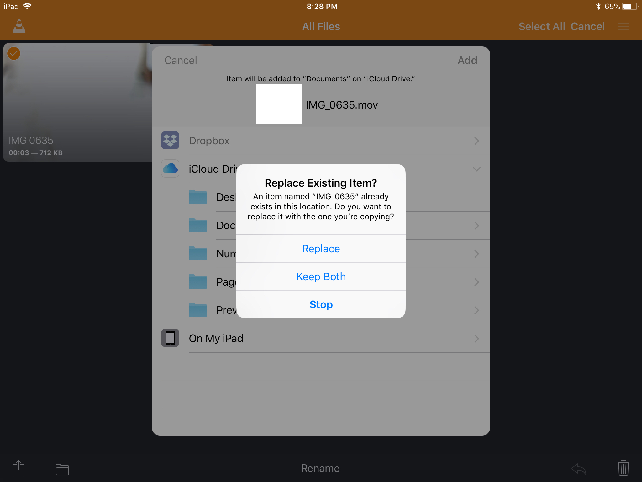 However once you are done doing whatever you are going to do to the video in VLC (or any video app) you can "Save to Files". If you select the same folder you originally opened it from it will ask you to "Keep Both" (rename one so you have both files) or "Replace" (copy over the original).