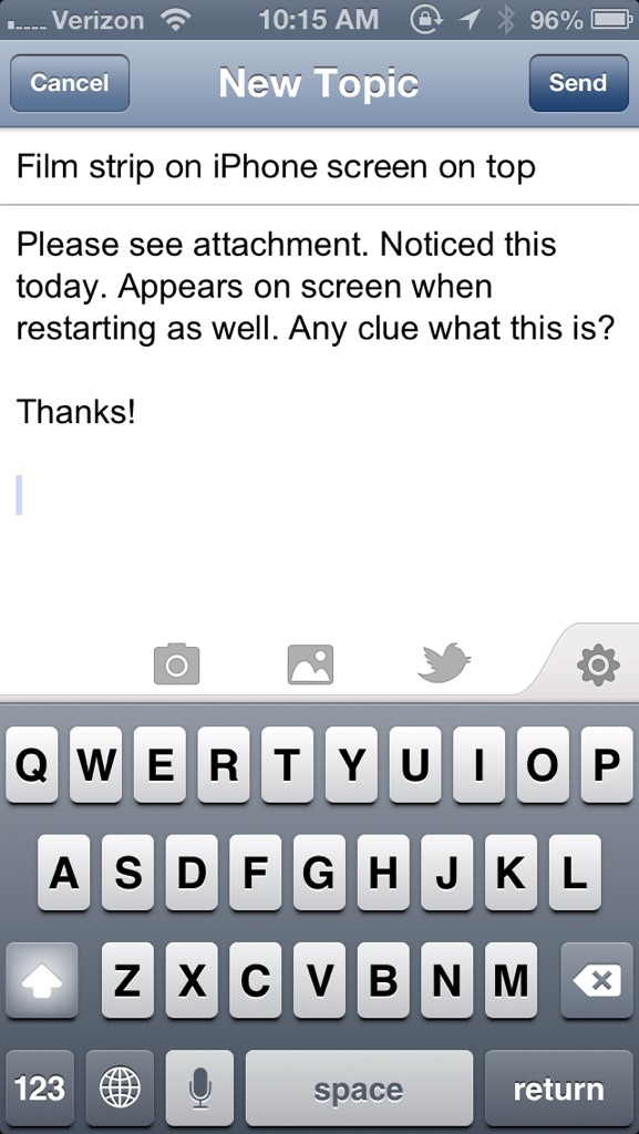 Edit: so it doesn't show in screenshot. It's probably my screen then... Anyone ever had this? There are grey film strip bars about .5 cm by .2 cm on top of screen.