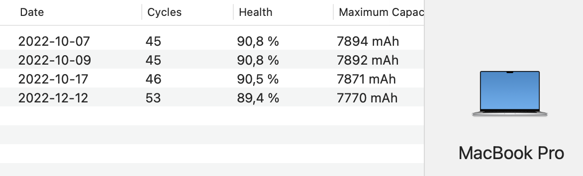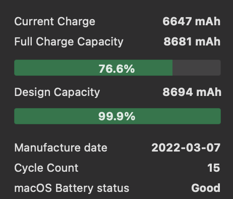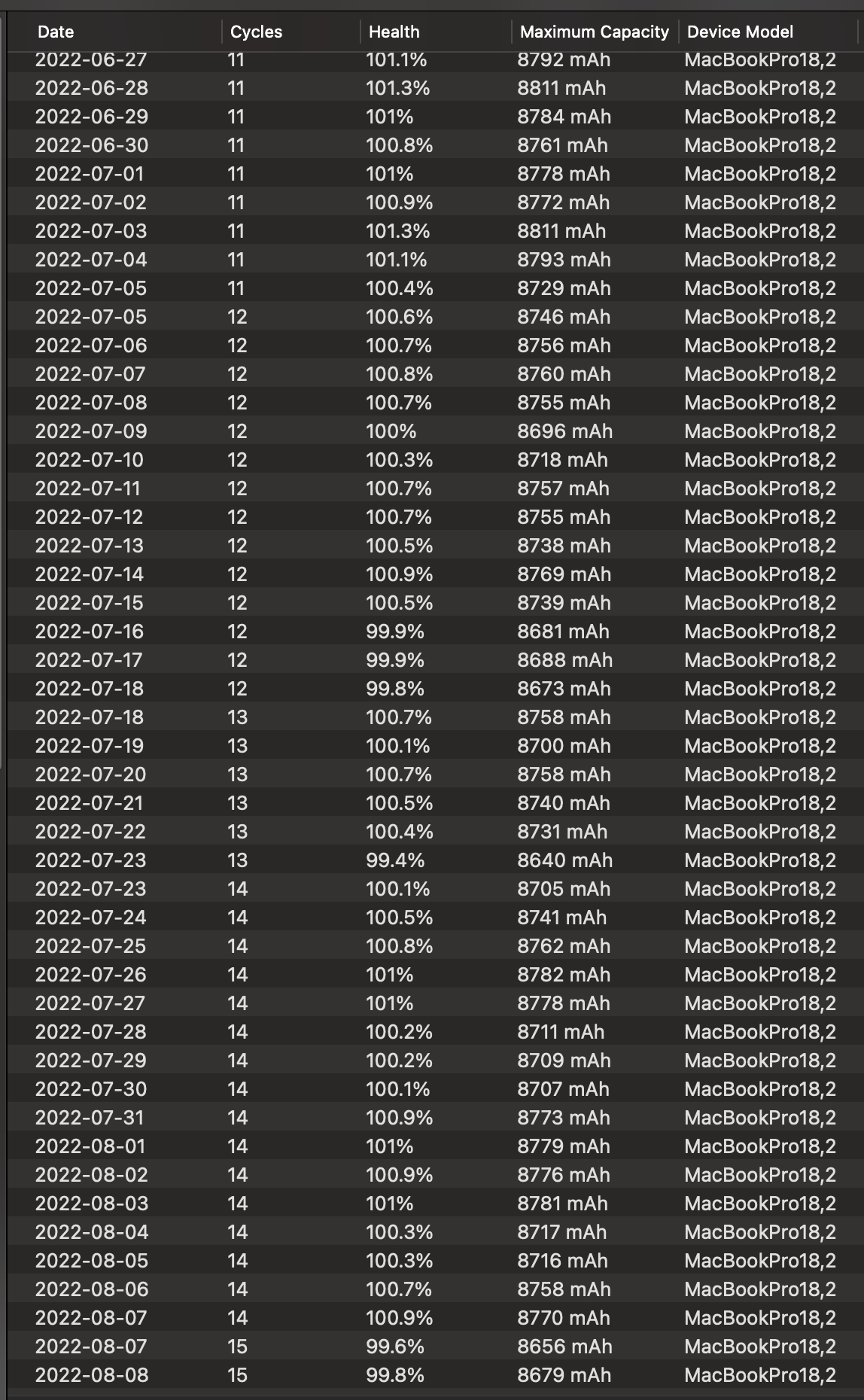 I then checked the 2020 and I've been a little less lucky, as it's currently at 149 cycles and is at 92.4%. Definitely not shabby, but these batteries are rated for 1000 cycles, so I rushed to judgment and initially assumed Apple MUST have sent me some kind of a defective battery (ah, Apple, screwing over their customers with lithium ion batteries that, you know, act like lithium ion batteries). After realizing I was complaining about a ridiculously minor problem (Seriously, who complains about a battery with 93% health), I did some research on this and discovered that this is pretty much entirely average behavior for the M1s. They tend to degrade more rapidly within the first year or so and then level off (according to the stats of Coconut Battery users at least), so it turns out my battery was fine after all.
