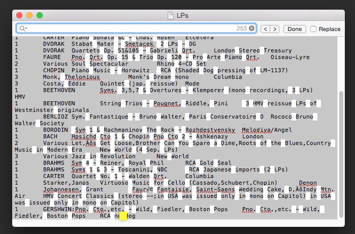 Thank you for supplying the file for me to test. @dsemf was right, the reason you cannot find any two or three consecutive spaces is because there aren't any. There are, however, lots of tabs. The only way to find a tab in TextEdit is to copy one to the clipboard and paste it into TextEdit's search box - TextEdit.app doesn't support searching for tabs with '\t'.The file is attached. artchoille50: Your theory sounds very possible. Is there a way to "Find" a tab? Glad to try that if I knew how to put a tab in the Find area!