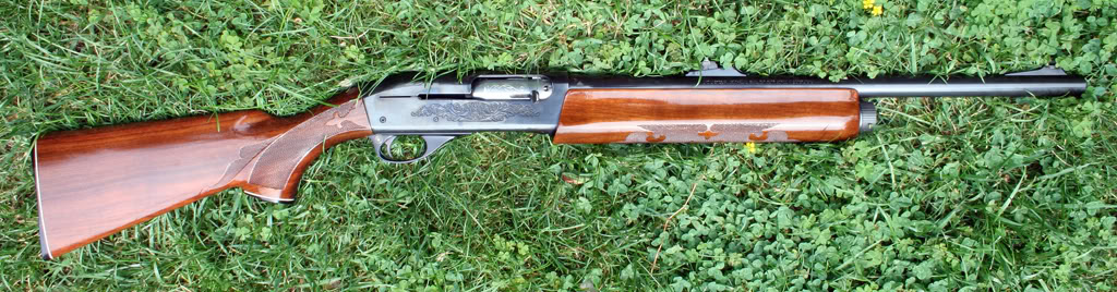 To make up for all the babbling, here's a pic of the Remington 1100 12 gauge semi-auto. Usually with a longer barrel for skeet, here I've got a 20" slug barrel on it, suitable for hunting deer, shooting targets or home defense.