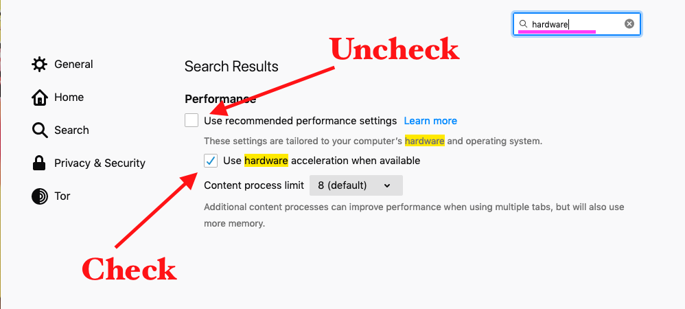 Open Firefox's preferences, type "hardware" in the search field. Uncheck "Use recommended performance settings", and uncheck "Use hardware acceleration when available". See the pic for the reference.