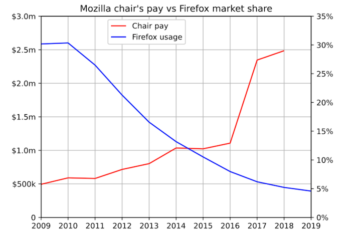 Look at this graph, FireFox market share down 85% but executive pay is increased 4x! They need to fire this incompetent management and save Mozilla.