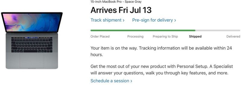 Customers who ordered one of the new 2018 MacBook Pro models that Apple released this morning are starting to see shipment notifications with the first deliveries of stock configurations slated for tomorrow.