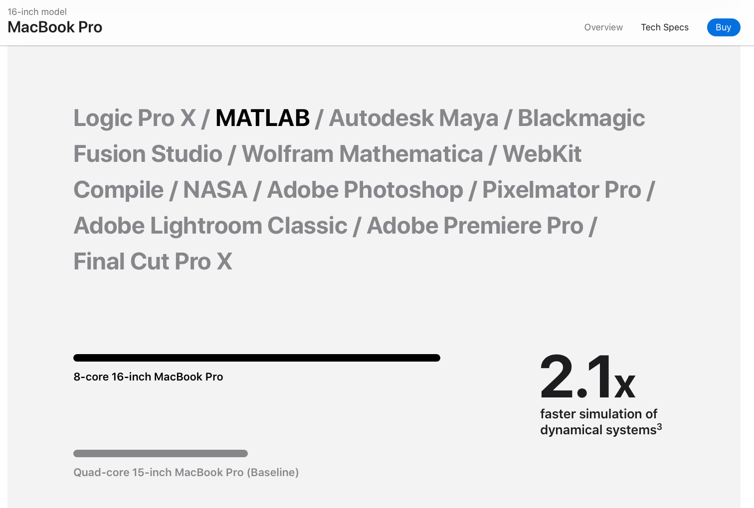 Moving to the AS MSP and iMac, and regarding their FP performance: While Apple isn't targeting HPC scientific computing, the Mac does have a strong presence among scientists, who use Macs not only for office work, but also for desktop scientific computing, e.g., with apps like Mathematica and Matlab, as well as for prototyping. Apple recognizes this, giving these apps equal prominence, in its marketing of the MBP and iMac, with "creative" apps like Autodesk, Logic Pro, Photoshop, etc. (see screenshot below). Many Mathematica and Matlab calculations are FP, so it will be disappointing if this is a weak area for AS.