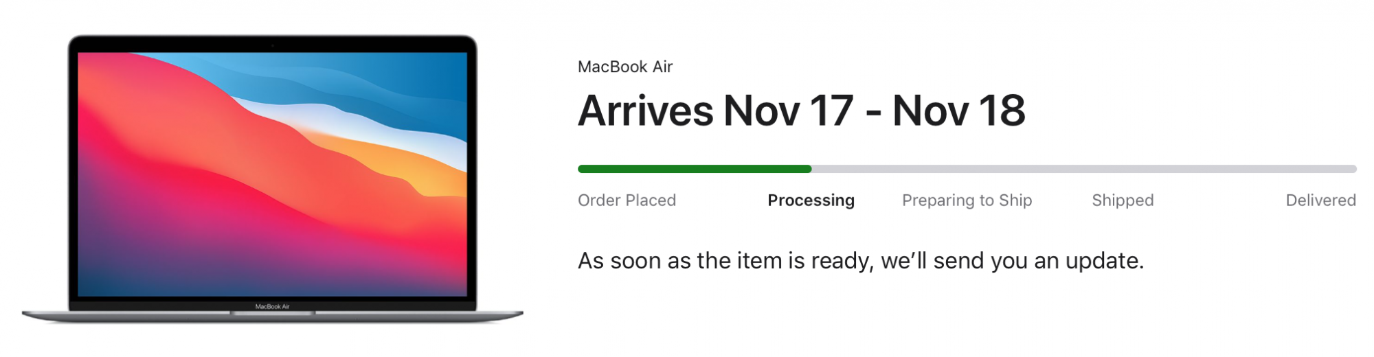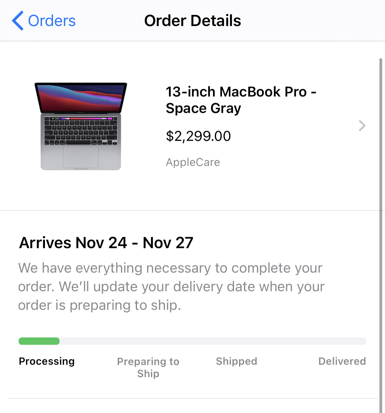 Yep. And that makes me so mad and confused at the same timeAnyone here ordered the MBA on Tuesday but the order still shows "in progress" or "processing"?