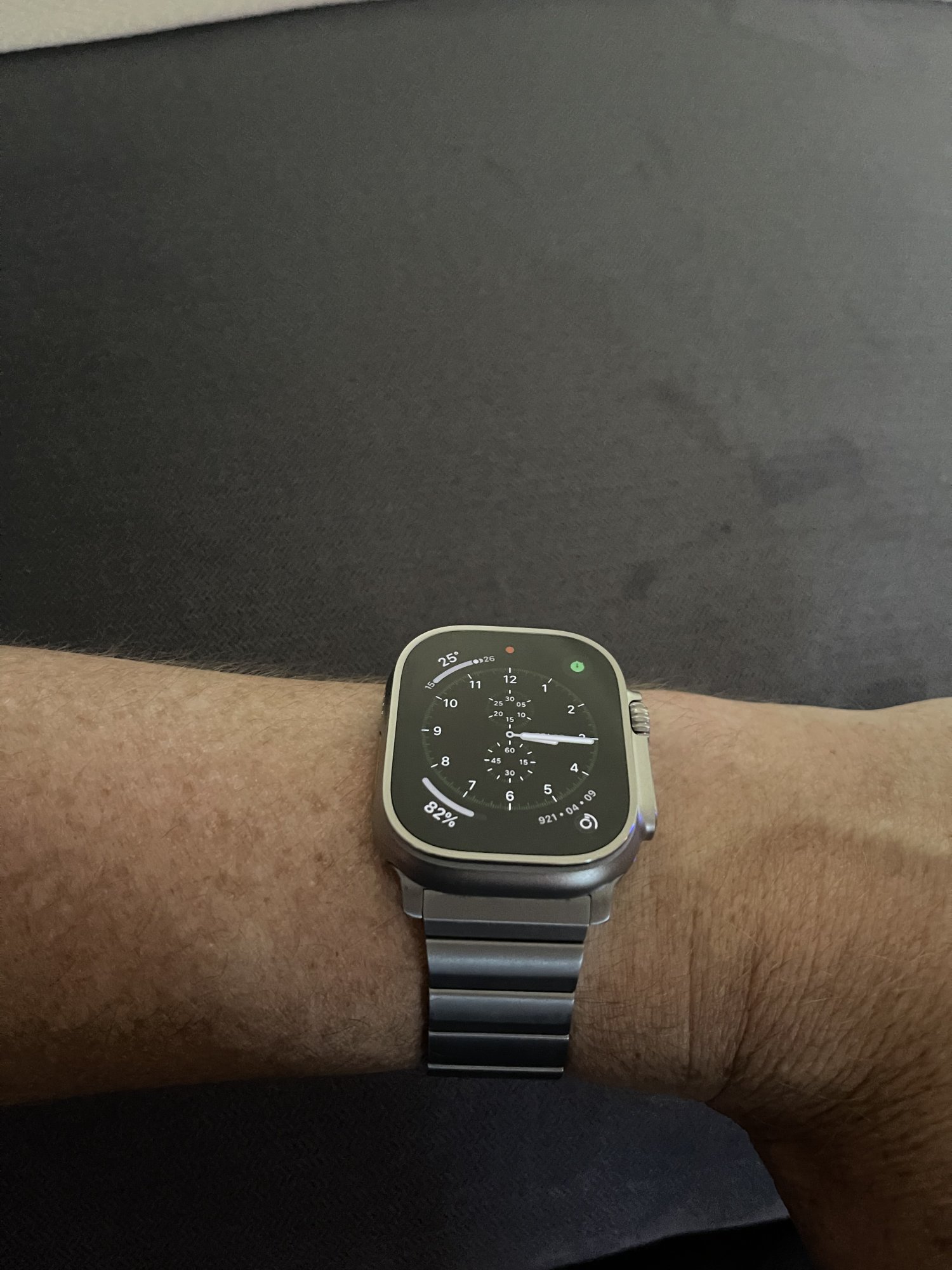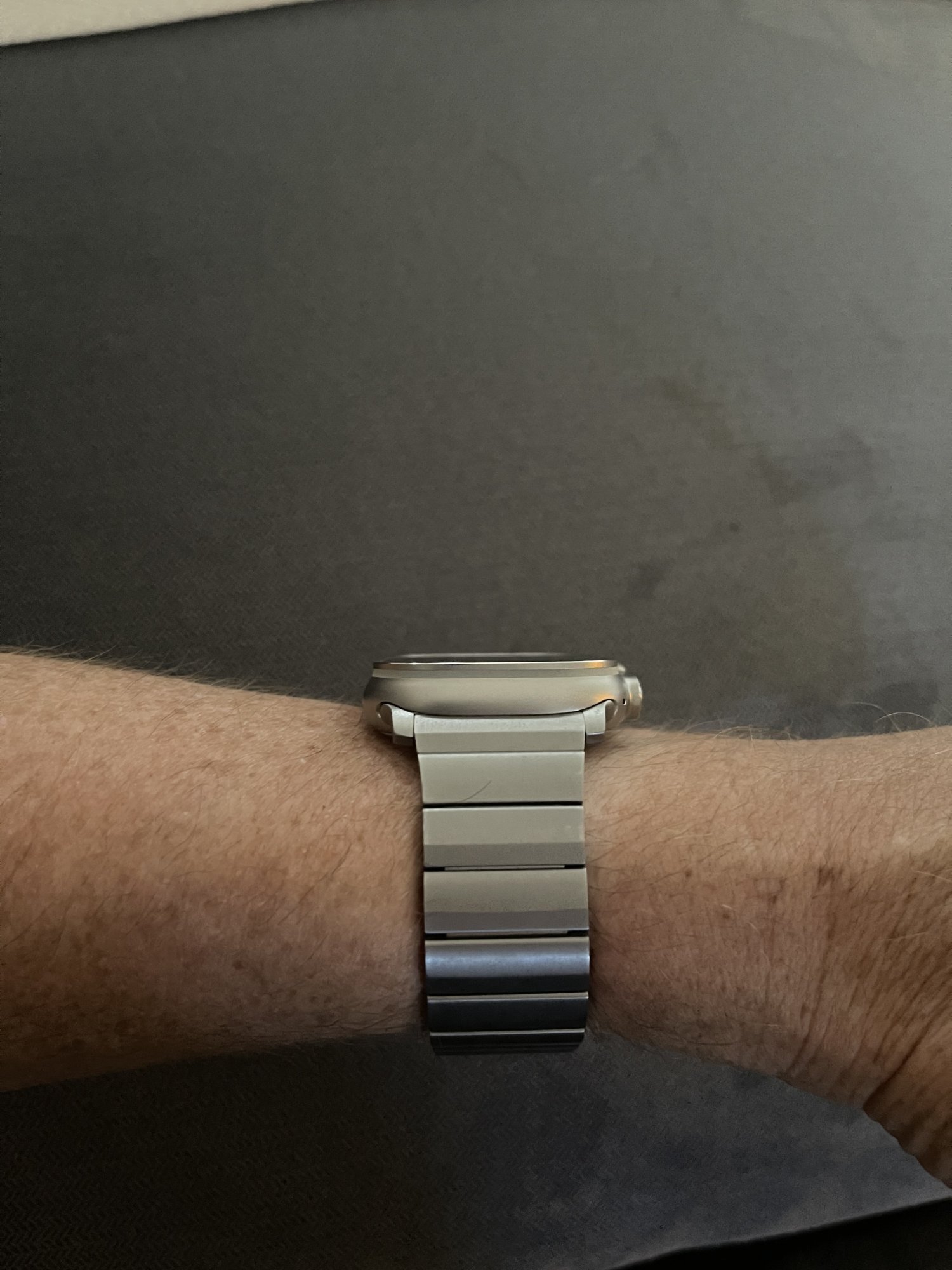 The old stainless Apple link band looks amazing on this watch body- the fit is perfect. It is coming out of retirement for this watch, having been laid aside for a succession of DLC black watches for the pst few cycles.