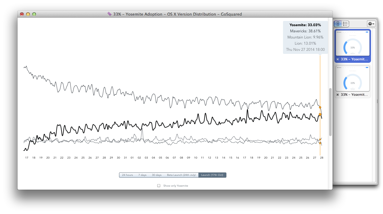 If you scroll down to the bottom of the GoSquared page, there's link to see Mavericks adoption rate. If you look at it, Mavericks went flat between May and July at approximately 50-55%, then it resumed its rise to top out in the 65-69% range.
