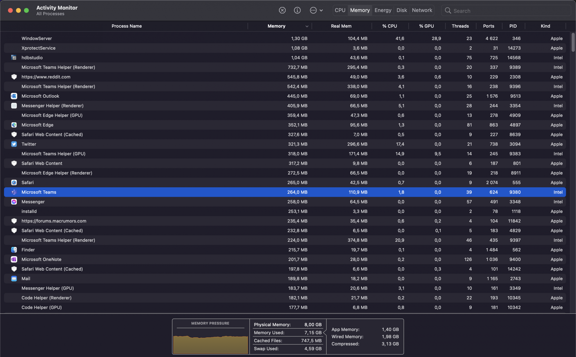 Also if you notice Teams is the big MEMORY hogger here alongside that legacy HDB Studio app I'm using both running under Rosetta.