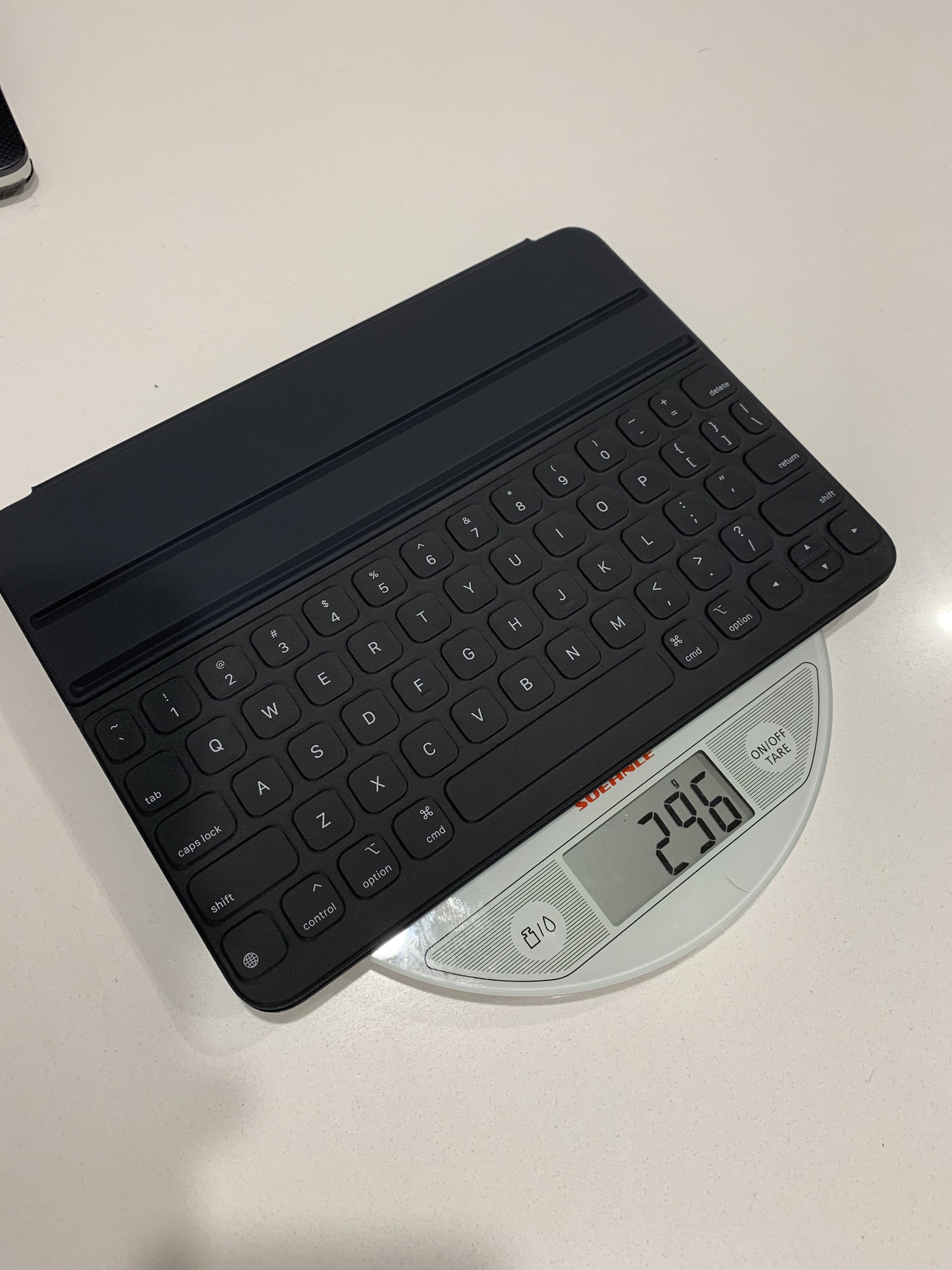 Smart Keyboard folio for 11” weighs 296gSorry to hijack the thread, does anyone have the weight for the 11” keyboard folio?