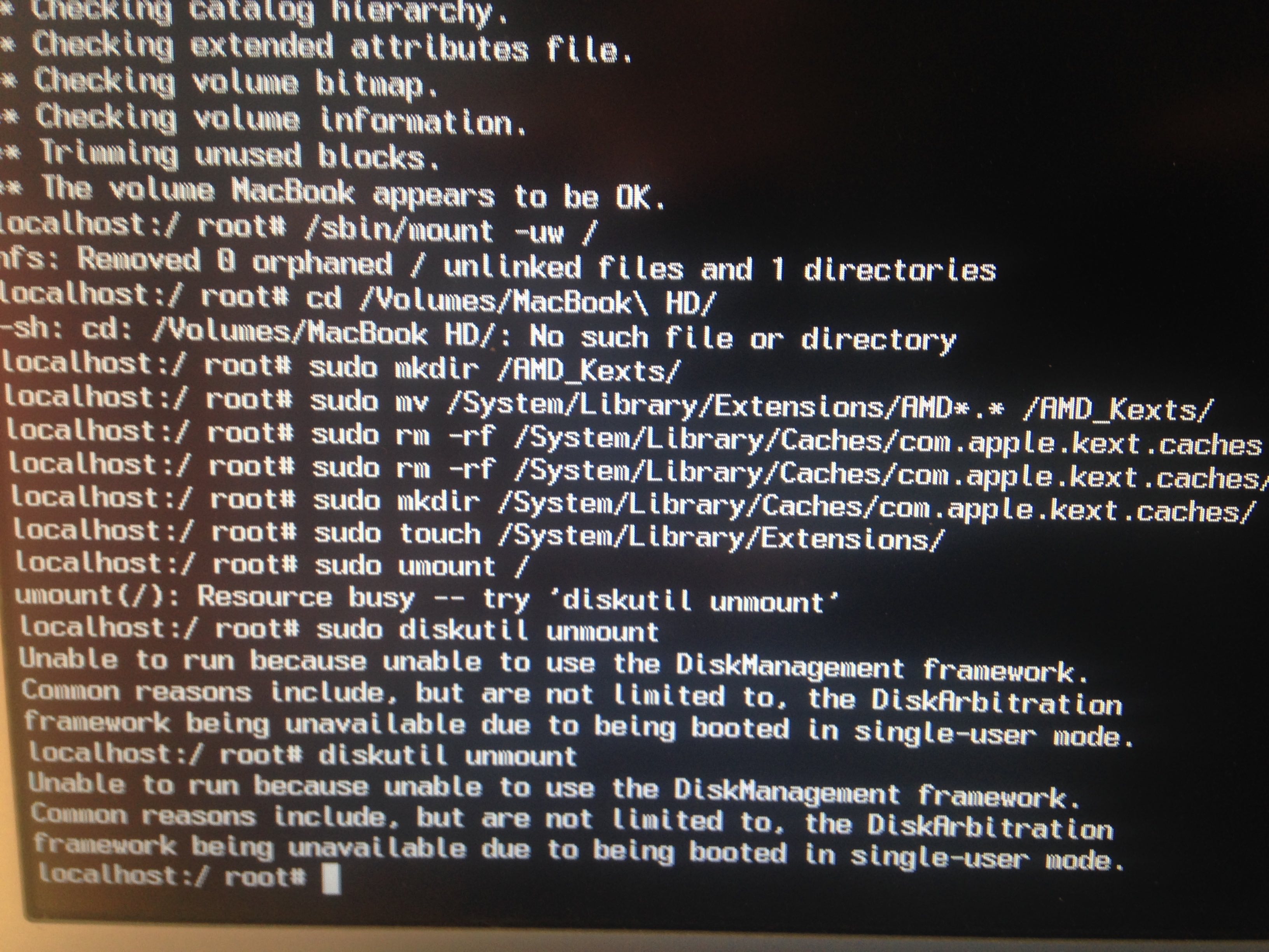 I suppose the terminal in Recovery mode would give the same result ('read-only file system') as single user mode when trying to move AMD kexts out of the way? Haven't tried it yet, but I don't think it is of any use.