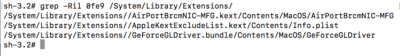 I'm using El Capitan 10.11.6 (test machine), so the results of the grep command on the kexts are a bit different from the Sierra and High Sierra.