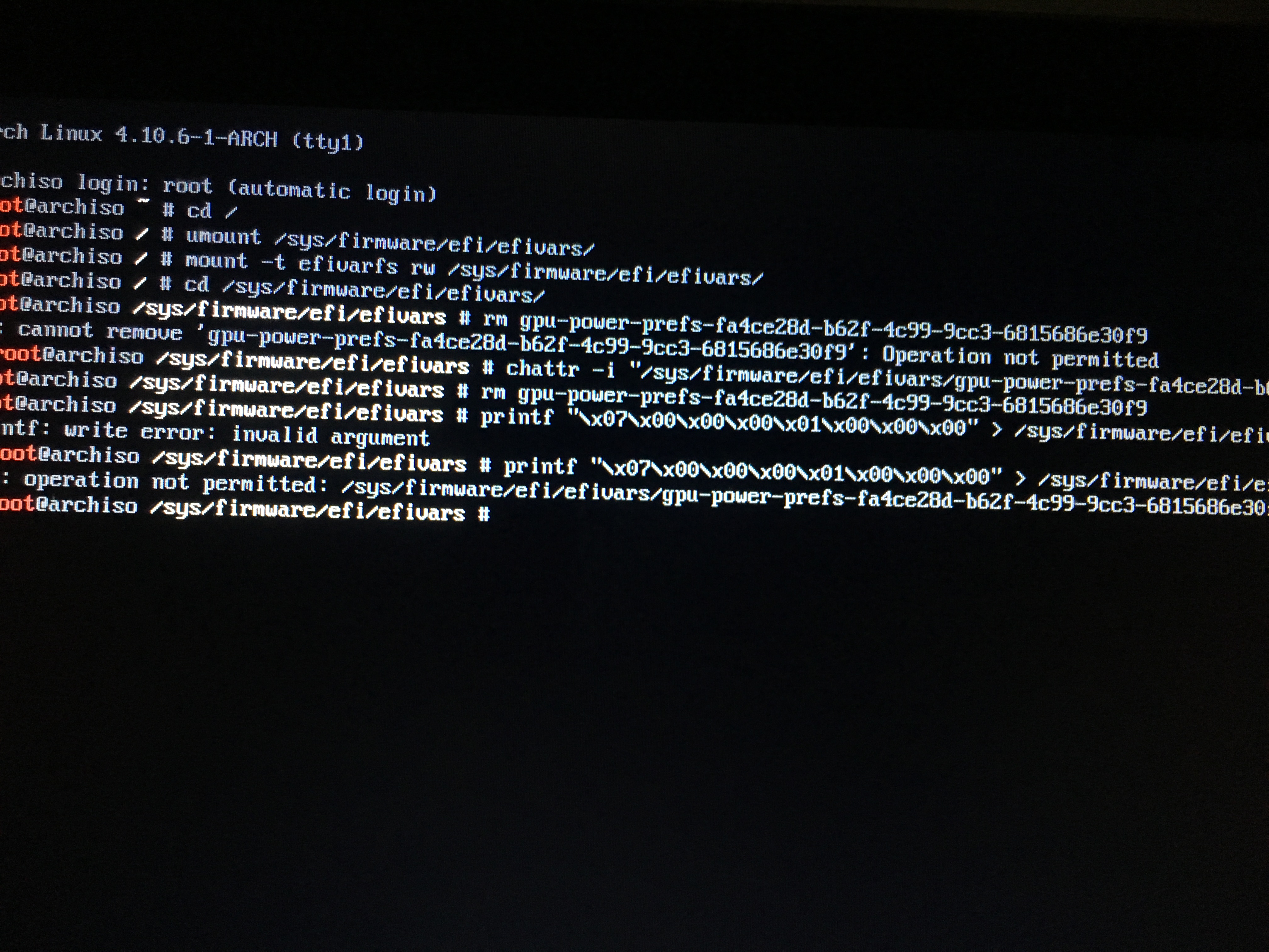 Next time, please try to show a full photo of your screen. For example, I cannot see what is happening at the left edge of the screen, e.g. why "root@archiso" shifted 2 characters to the right. It could be that your EFI variables partition became unmounted because of some error, or that it became read-only somehow, and that is why you can't write a correct value to this variable using printf