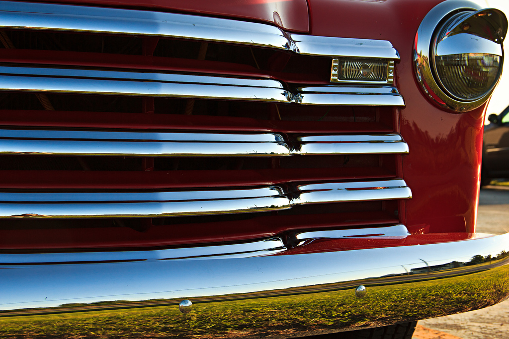 Nice one. The bumper and grill fill the frame with just enough background to make it obvious what we're looking at. I'm glad I don't have to keep it polished!I liked the farmhouse across the street that reflected into this truck's bumper.