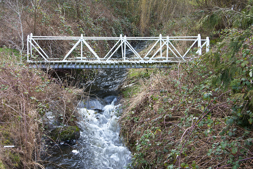 The trash in the lower left is bad- it's important to look for that in landscape shots- it's only good if you're showing urban decay in the shot, otherwise it's a bad distraction. I think the framing doesn't work- the horizontal bridge with horizontal framing just has the eye go over the bridge and off the edge of the frame. The water would be a better subject with more vertical framing, but it'd probably still need more motion blur to draw the eye away from the white bridge- with some wind and plant motion blur, it might help simplify the composition as well. Overall though, I don't think the water or the bridge make a good central subject here- a bike, dog or person on the bridge might, but again since the subject is nature, I don't think that's going to save the image for the sake of this challenge. I'd still go with a vertical composition to let the water try to draw the viewer into the scene realizing some depth (as it is, it's very 2D with the bridge.) Without anything surrounding the image that's not predominately nature like a road, concrete walls, etc. I'm not sure you reach the "unexpected" goal. If the steam and plants were in a much wider-angle composition that showed a busy intersection, then we'd be in play.