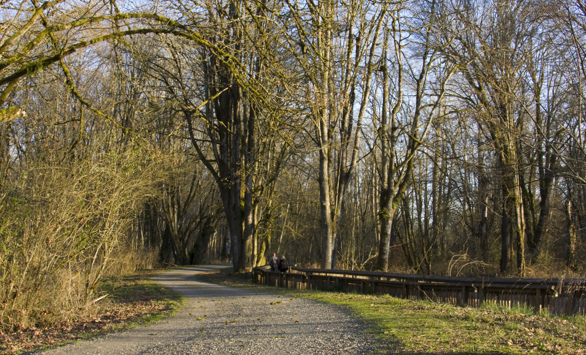 Lots of nice leading lines here: the arcing tree branches in the upper left corner, the railings, and of course the gravel road. I see a square composition hiding in this one. All of that space at the right isn't doing anything for the photo, and it makes the two figures have less presence in the frame. So I would crop it down, coming in a lot on the right and bit on the top, with the two figures falling roughly near the intersection of the thirds in a square frame. I tried it, and I think the image really starts to hum that way. You might also consider dodging the midtones of the figures a bit.