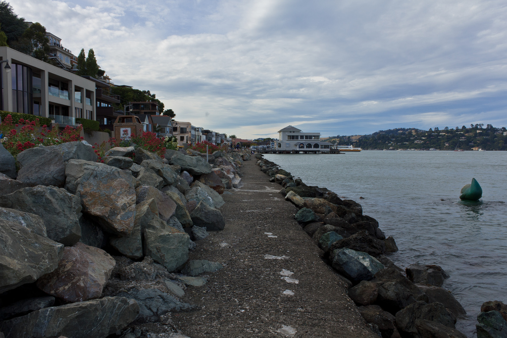 I prefer this second shot because there is more artificial lighting to give the photo some contrast. You said this was a morning shot. I think you were about 10-20 minutes too late for the perfect balance of light, when the sky would be a deeper blue, and the lights would jump out and and sparkle more. Nonetheless, the low vantage point definitely adds some visual interest, as does the dew causing a reflection on the planks. I also like that there are no people here, since it's a location that is surely full with them most of the day.