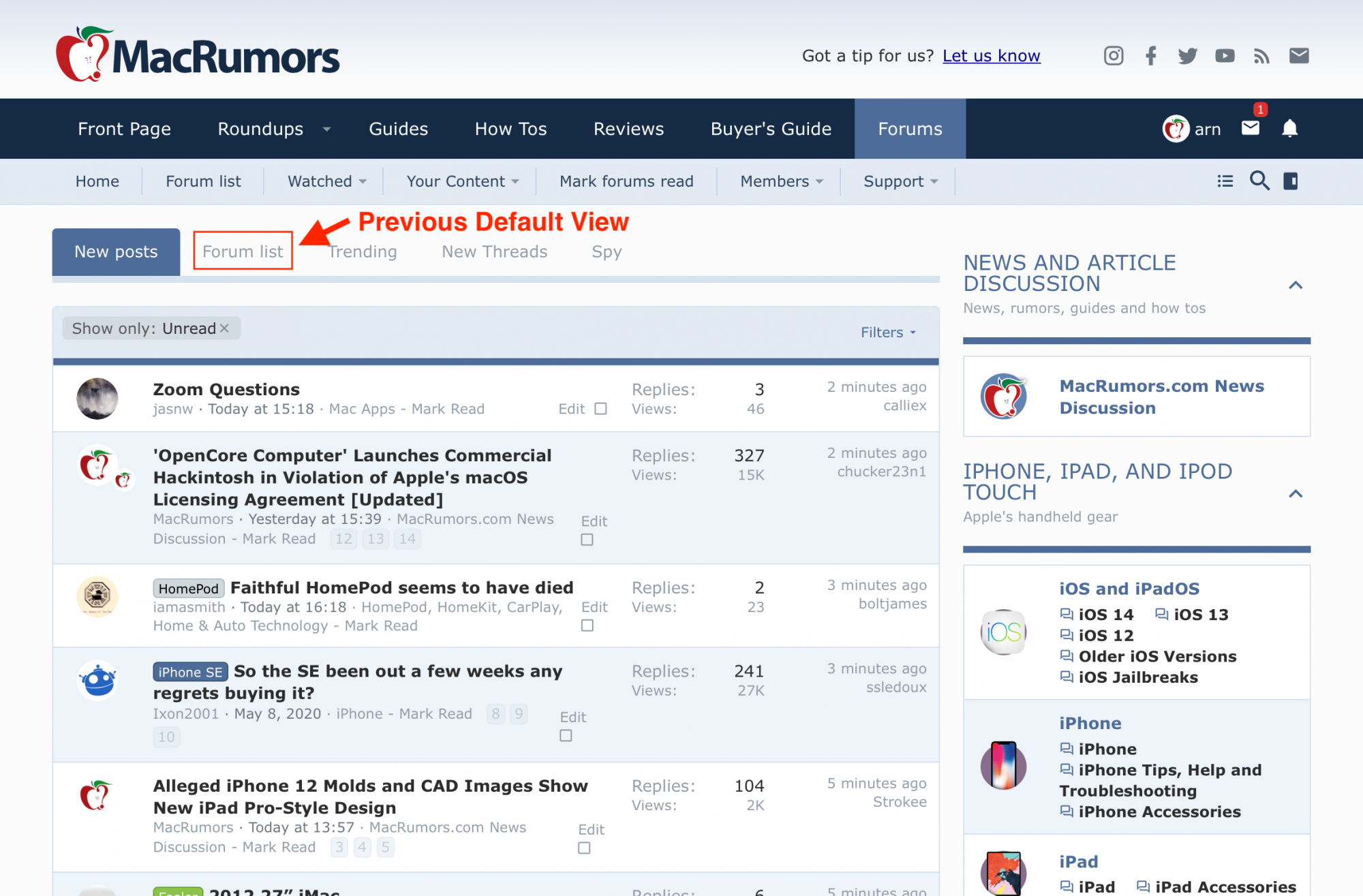 I've made a change to what the default forum home is. That means when you visit https://forums.macrumors.com/ - it now shows "New Posts" view instead of "Forum List".