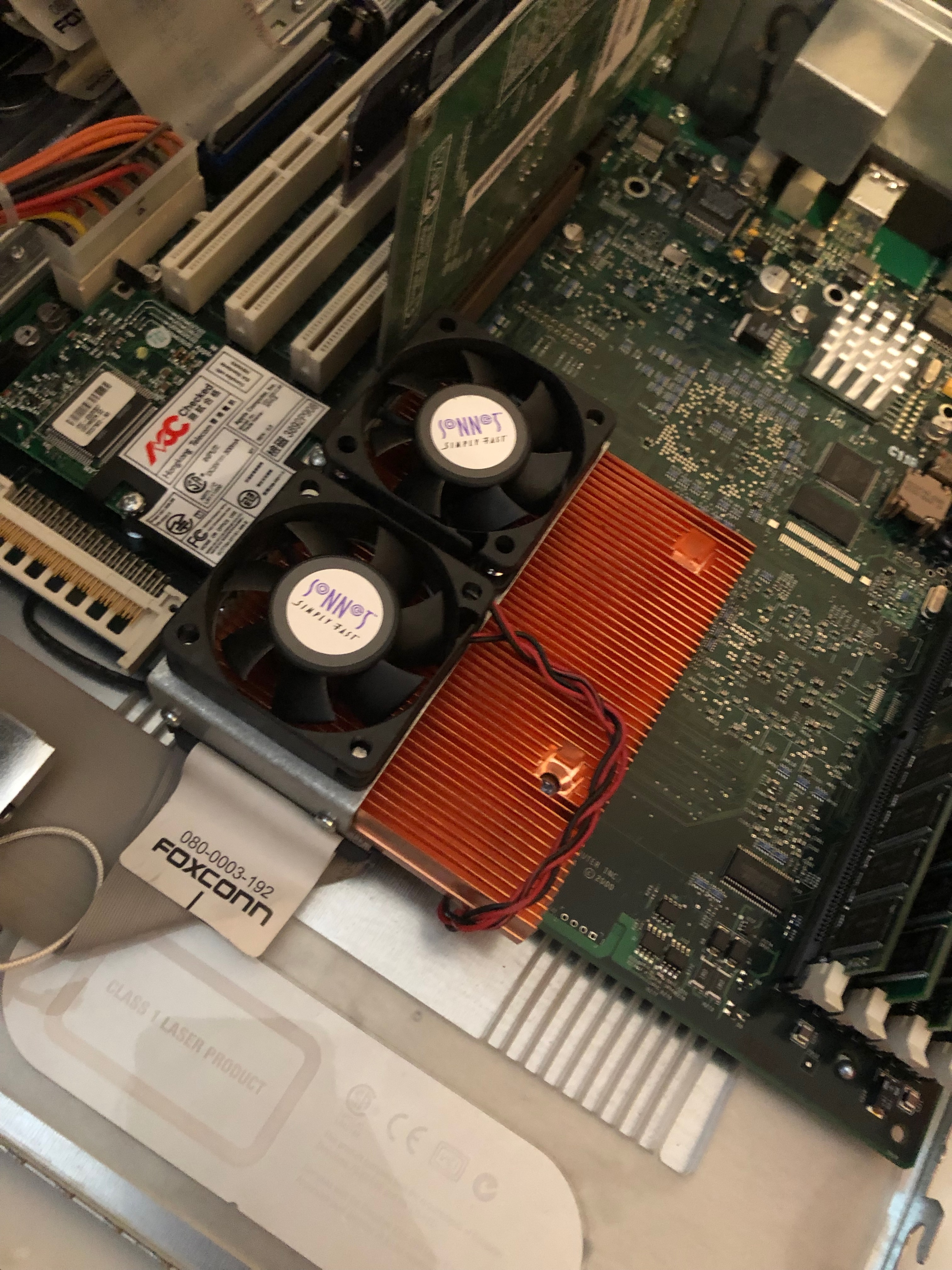 Found an older DP G4 for sale today. Nothing was very interesting until I saw the CPU cooler. Huh, dual fans and a copper heat sink? It MUST have a Sonnet CPU upgrade! Went and picked it up for $40. The OS kernel panics so I had to pull the CPU speed from Open Firmware. After converting the hex to a regular readable number, it turns out to be a Dual 1.8GHZ upgrade! Too bad it won't work in our Cube, but the money from the sale of it can go twords a proper Cube CPU upgrade. Up to ebay it goes along with the Sonnet USB 2.0 card and PCI wifi card!