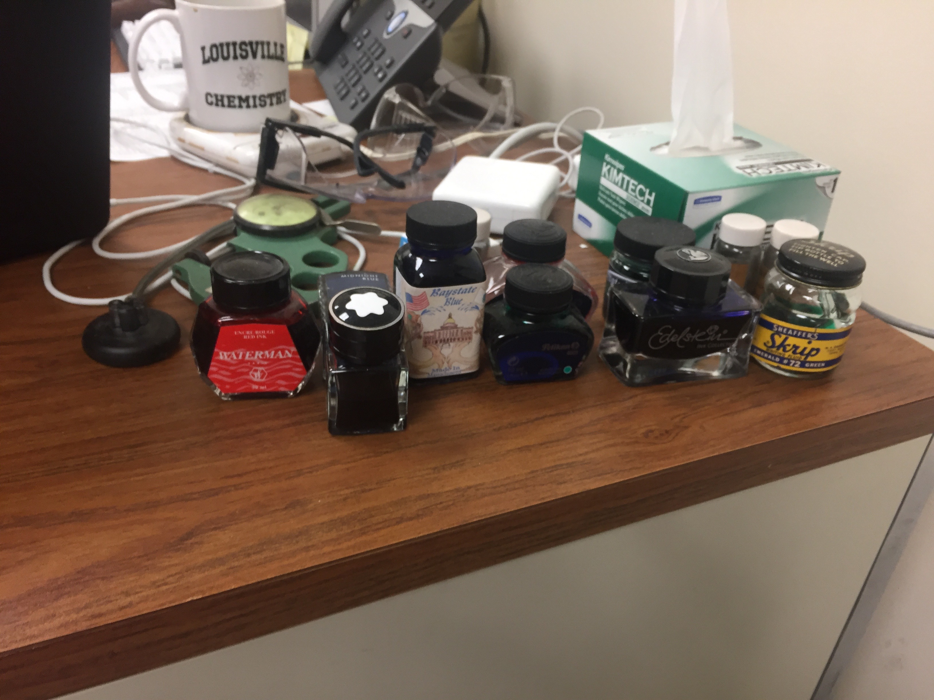 Also, for grading purposes I tend to use either Pelikan Red or Sheaffer Green. Pelikan Red has a nice distinct color that isn't as "in your face" as a lot of red inks but also serves as something of my signature when I working with graders. The Sheaffer is also distinctive looking, and being 30 year out of production has its advantages. In particular, a student altering their grade is fairly obvious, as they likely aren't going to be able to match the ink. I've even mixed my own burgundy-brown grading inks for that reason.