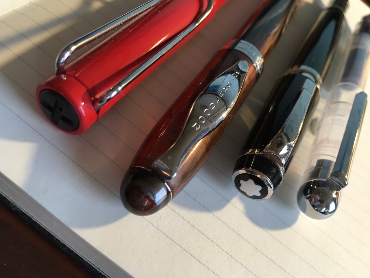 My current clutch… missing is the Mont Blanc Meisterstuck 149. Lying in storage right now, I fell out of love with it — very ostentatious, feels like you're signing a declaration of war or the like.