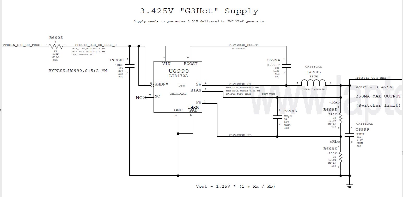 After removing the Coil L6995 to figure out where is coming from the short, it comes after the Coil : C6999 is also shorted to ground but it is not responsible of that short. So another componant is putting this track to the ground. OK need to find out witch one it is......BUT beside that i've mesured the output of U6990 on pin 4 (P3V42G3H_SW ) without L6995, i should normaly read 3.42V but strangely i'm reading 15.2V????