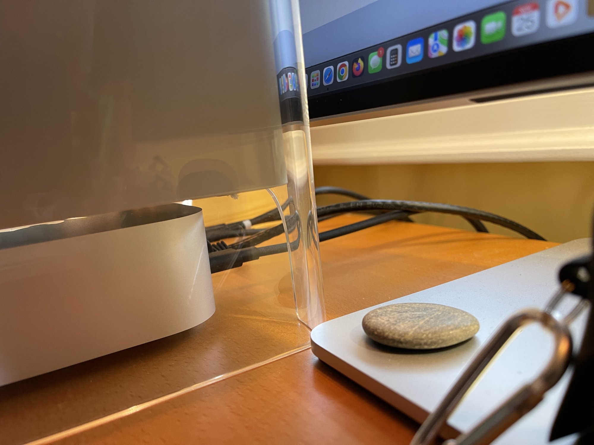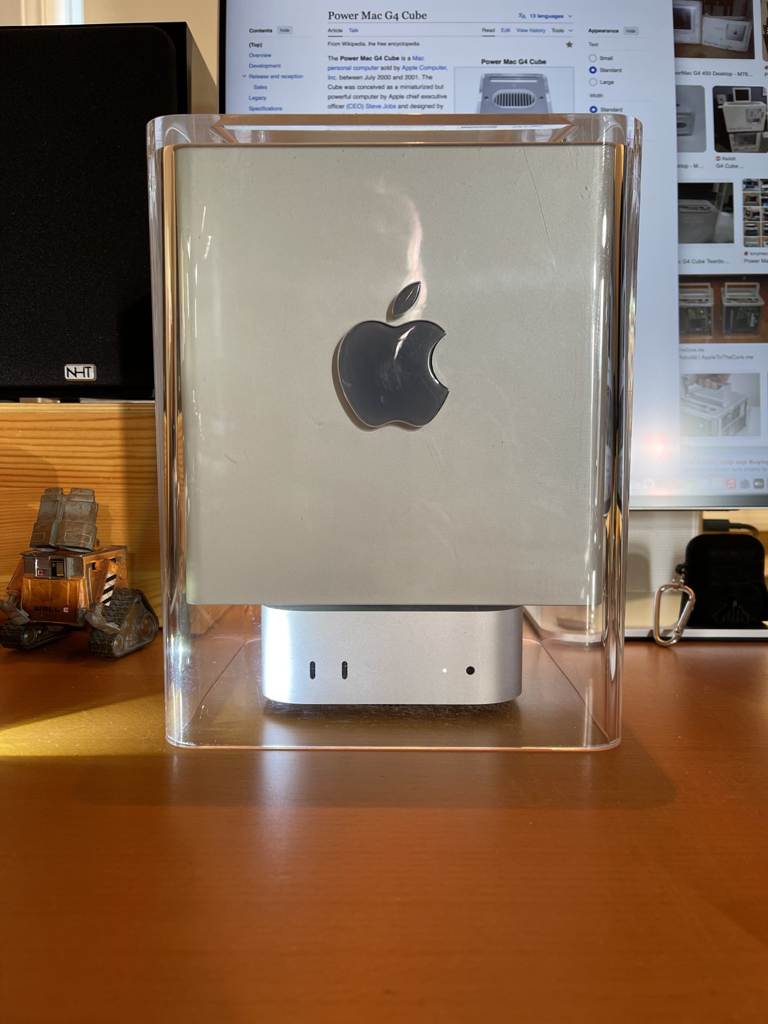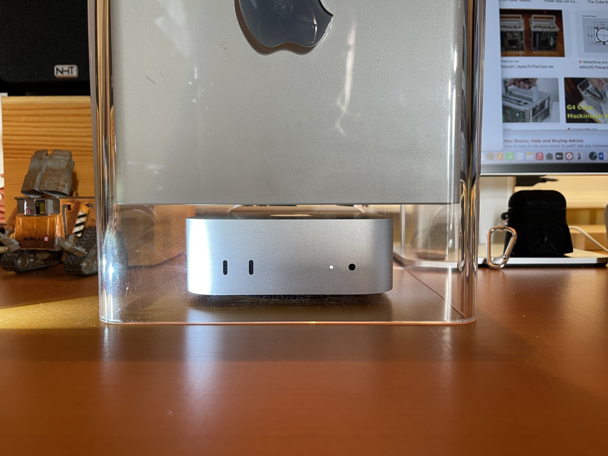 However, as you can see, the Cube looks absolutely humungous on my desk in comparison to the mini. While I could rearrange things to accommodate the Cube and mini together elsewhere on my desk, it's not practical. Not only is the Cube too big, you lose access to the front ports and... dare I say it... the power button. I'd rather just keep the Cube on display on its own for now.