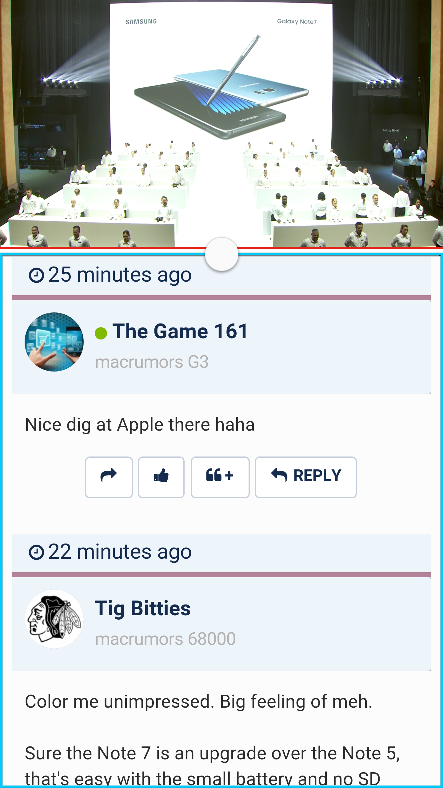 My S6 is seriously just as fast, smooth and lag free as the first day I bought it, 10 months ago. I actually prefer the extra functionalities Touchwiz offers compared to stock Android. In my opinion, stock Android is a bit overrated. For example, I like how Samsung offers true multitasking (split screen). On the Nexus 6P you have a 5.7 inch screen and you can't even use two apps at the same time. What's the use of that big screen then? I use split screen all the time, for example just a couple minutes ago to watch the Note 7 event while browsing the MacRumors forum (see screenshot below). Also getting the latest Android update later isn't that big of a deal either. The phone will not suddenly become unusable or full of viruses when using an older Android version for a couple of months longer.