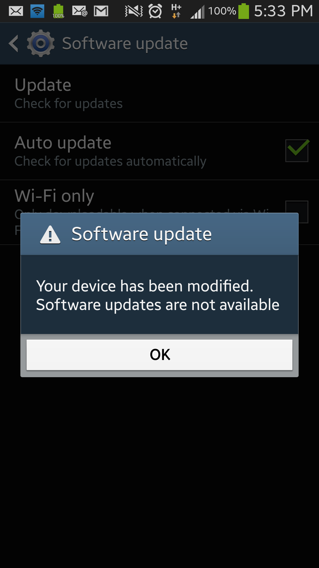 I have a completely unrooted, unROM'd, perfectly stock Galaxy S4... which tells me the device has been modified every time I try to check for updates.