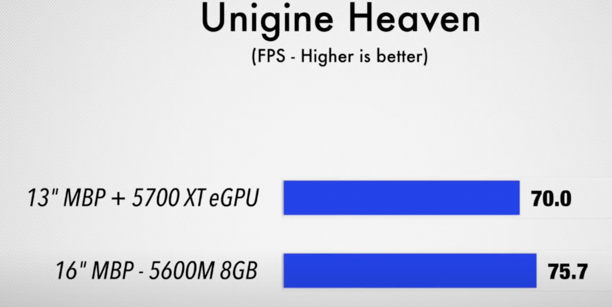 It's interesting on the video above they compare the 5700 XT eGPU on MBP 13 vs 5600m on the MBP 16 and gives better performance well at least on Unigine Heaven, I wonder what would be the difference if it was egpu + MBP 16 instead. View attachment 925007