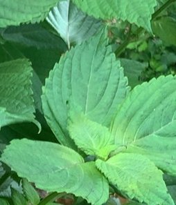Perilla frutescens var. crispa has been cultivated by the Japanese for centuries, known to them as shiso.I’ve noticed this largish symmetrical plant growing in the middle of a flower shrub bed. It’s about 3’ tall. I was telling it your so bold I’ll give to a chance, while wondering if it’s a weed. I turned on my Plant Snap App and it identified it as Perilla Frutescens, with a possible secondary ID as Hydrangea. I pulled off a leaf and compared it to our hydrangeas and it looked identical, but the branch structure was not as gangly as the hydrangeas .