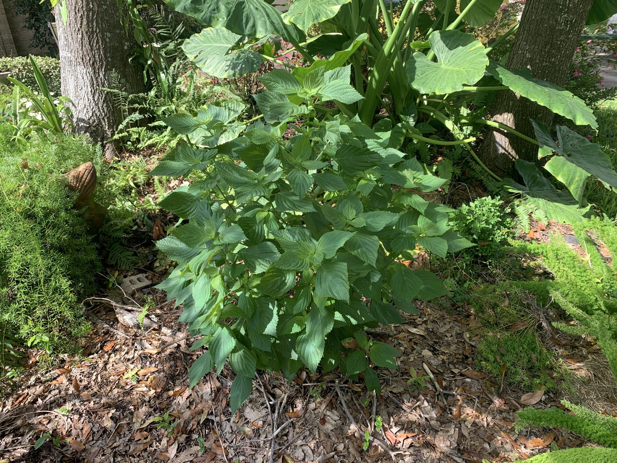 I located a resprout or volunteer of what I planted last year, Coleus. Still waiting to see what the mystery plant does.I’ve noticed this largish symmetrical plant growing in the middle of a flower shrub bed. It’s about 3’ tall. I was telling it your so bold I’ll give to a chance, while wondering if it’s a weed. I turned on my Plant Snap App and it identified it as Perilla Frutescens, with a possible secondary ID as Hydrangea. I pulled off a leaf and compared it to our hydrangeas and it looked identical, but the branch structure was not as gangly as the hydrangeas .