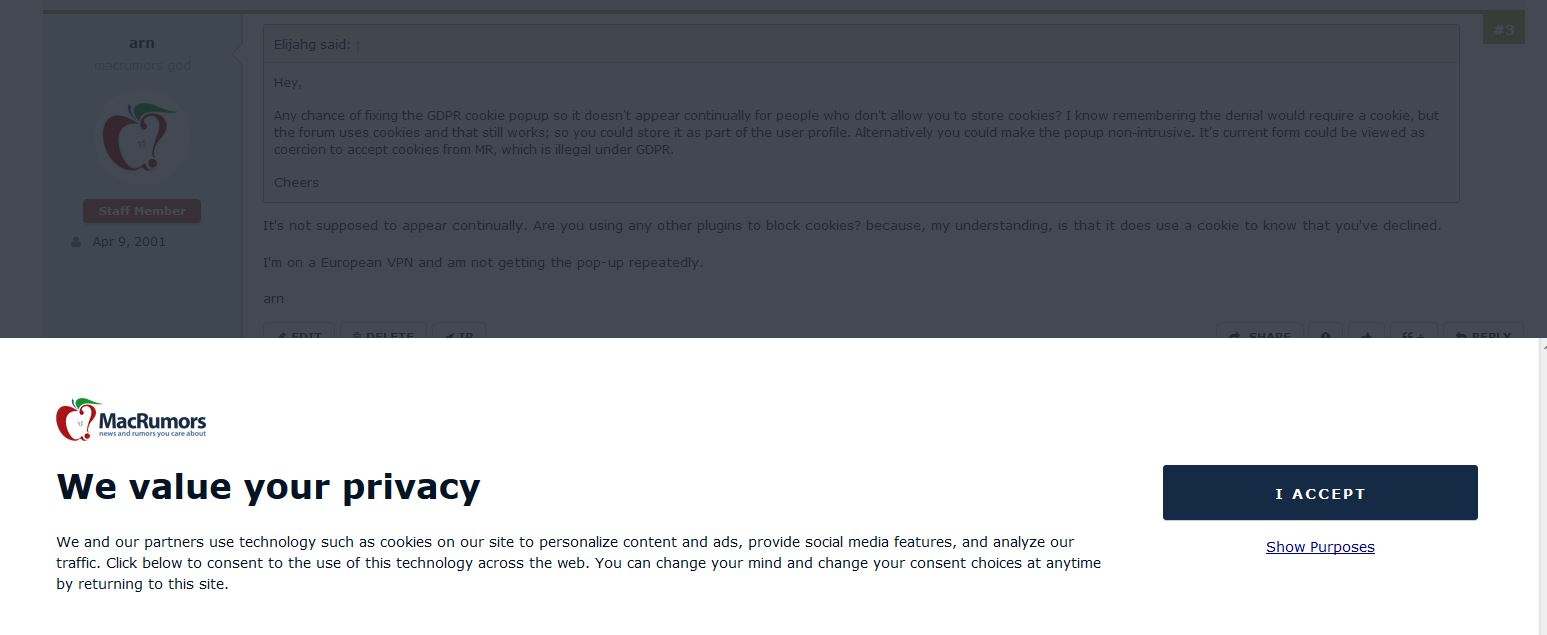 Any chance of fixing the GDPR cookie popup so it doesn't appear continually for people who don't allow you to store cookies? I know remembering the denial would require a cookie, but the forum uses cookies and that still works; so you could store it as part of the user profile. Alternatively you could make the popup non-intrusive. It's current form could be viewed as coercion to accept cookies from MR, which is illegal under GDPR.