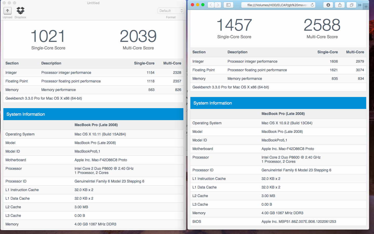 the geek bench scores make me a little sad.. run it like 3 times.[fyi left el capitan, right mavericks]