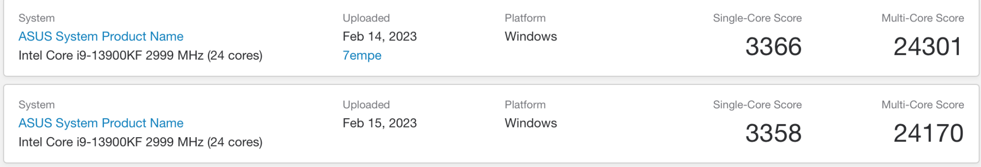 I looked again and only found these, but thought I had seen more previously:Where are you getting 3350 ST for 13900k? It shouldn't be that high. It could just be a highly overclocked and RAM optimized computer.