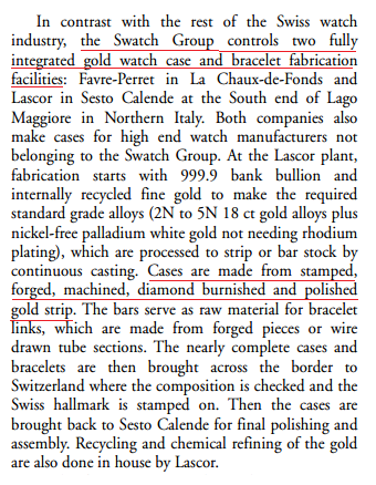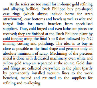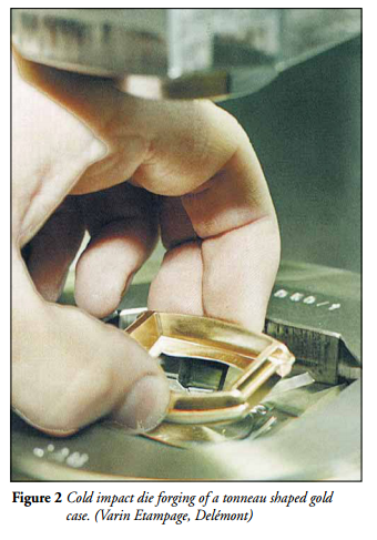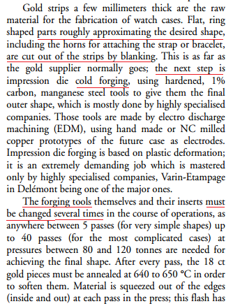 With other companies like Rolex, Swatch Group, Patek Philippe, the case blanks are cold forged into the proper shape. This causes a final work hardening, which is desirable both for strength and for better shine after hand polishing. This forging takes multiple passes, changing the die each time. It's labor intensive but produces a superior product.