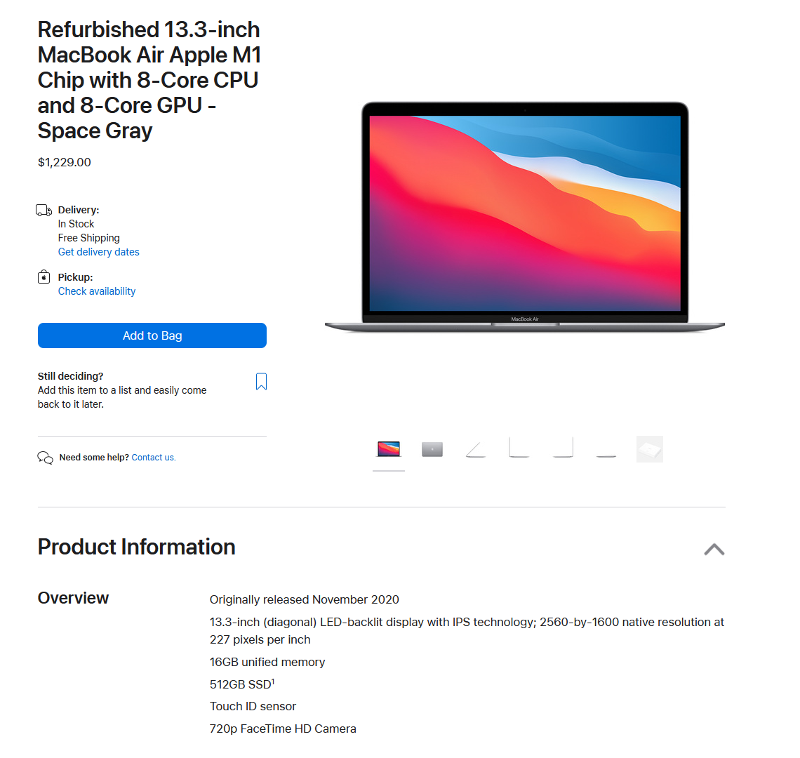 Refurbished 13.3-inch MacBook Air Apple M1 Chip with 8‑Core CPU and 8‑Core GPU - Space Gray