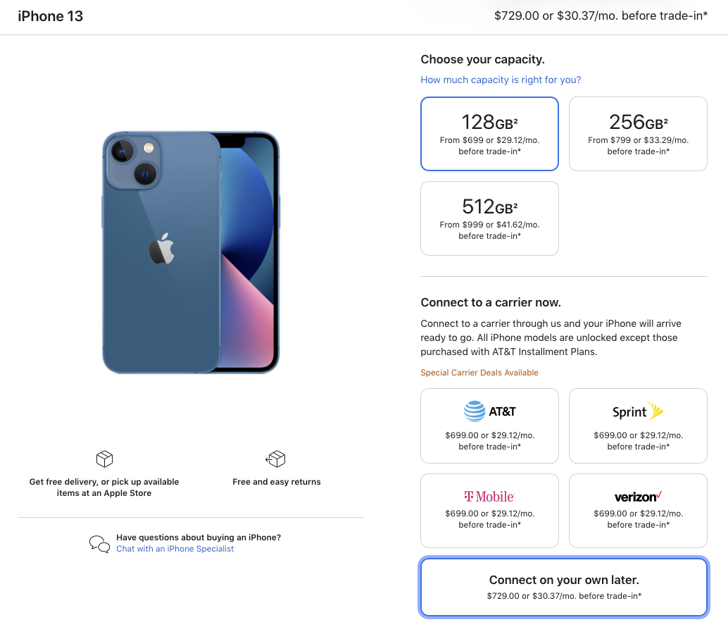 The storage capacities available for the iPhone 13 and iPhone 13 mini include 128GB, 256GB, and 512GB, while the iPhone 13 Pro and iPhone 13 Pro Max also have a new 1TB storage option. Pricing continues to start at $699 for the iPhone 13 mini, $799 for the iPhone 13, $999 for the iPhone 13 Pro, and $1,099 for the iPhone 13 Pro Max.