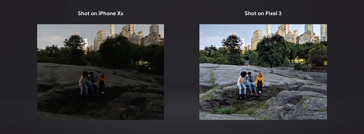 The company focused on the Pixel 3's advanced camera, including an HDR+ mode and "Top Shot," which automatically captures multiple shots with HDR+ and recommends one that might be better than your photo. Night Sight will enhance photos captured in low-light scenarios, and Google compared nighttime images on the iPhone XS with those taken on Pixel 3. Users can also now edit the depth of field effect in portrait mode, like on iPhone XS and XS Max.