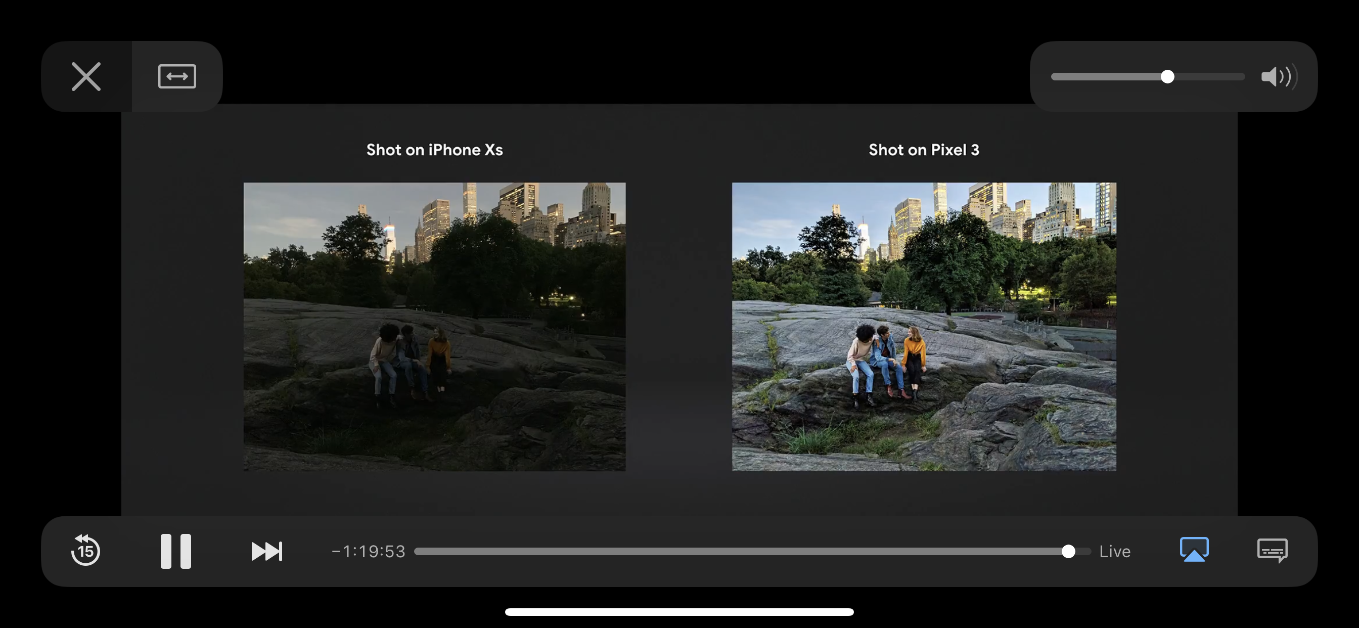 The company focused on the Pixel 3's advanced camera, including an HDR+ mode and "Top Shot," which automatically captures multiple shots with HDR+ and recommends one that might be better than your photo. Night Sight will enhance photos captured in low-light scenarios, and Google compared nighttime images on the iPhone XS with those taken on Pixel 3. Users can also now edit the depth of field effect in portrait mode, like on iPhone XS and XS Max.