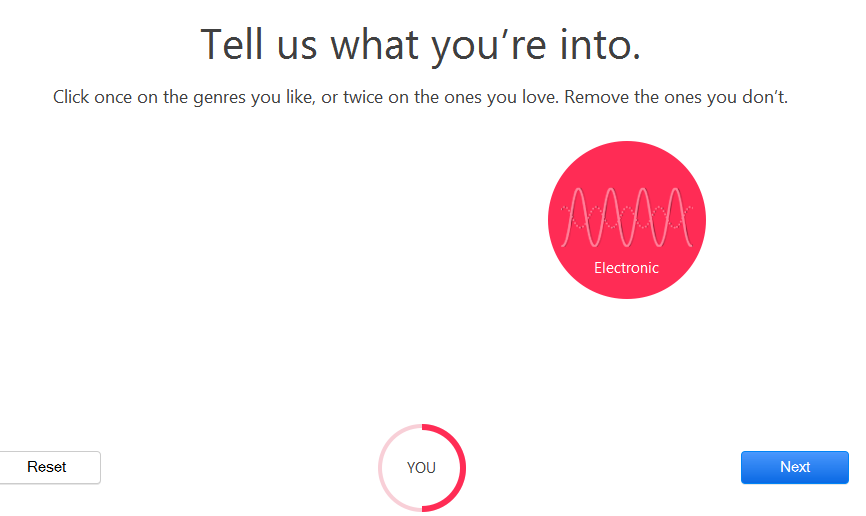 I was just redoing that section to show you what I had selected. You keep saying take pick an artist or too. But what do you want me to pick? Taylor Swift or Rihanna or Drake or Dr Dre when those are my only options? Kelly Clarkson? I don't like any. I keep hitting dislike/remove and only new pop artists show up. Katy Perry. If you keep right clicking and saying don't like, eventually the screen goes blank and there are no options. So how do I finish this wizard when there are no artists that are no pop or rap?