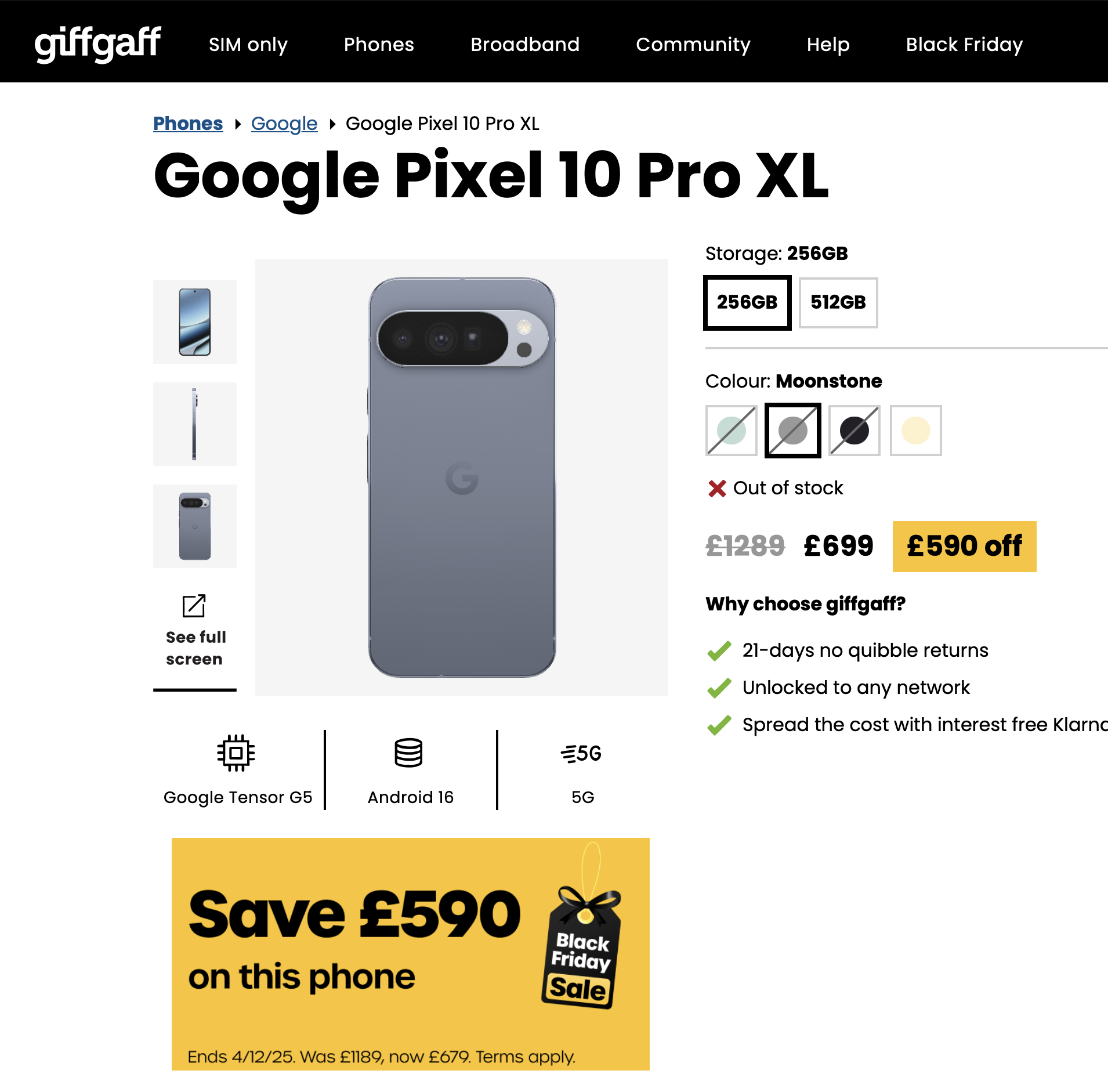 Giffgaff have stock of the XL Pro in moonstone. They had around 8 black ones an hour ago.Google are now advertising their Black Friday deals which start next week, with up to £200 off the Pixel 10 Pro lineup. That still doesn't beat GiffGaffs £699 for the Pixel 10 XL.